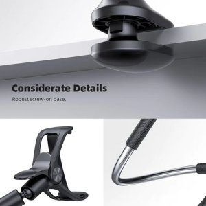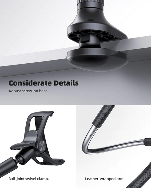 The Gooseneck Phone Holder uses longer leather-wrapped arm(98cm), more flexible 360 Adjustable & Rotatable ball joint phone clamp design and a reinforced base, which gives it a better texture, stability and flexibility. A perfect flexible phone holder that can free your hands to watch movies, make Facetime calls or record videos, etc.